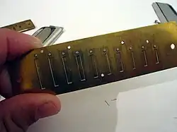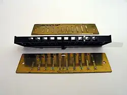 Possui duas palhetas em cada furo afinadas com intervalo de uma oitava entre elas.