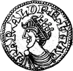 - ↑ O próprio Canuto havia adotado a triquetra de usos nórdicos anteriores, vendo-se como um Escildingo. Seus sucessores também usaram o símbolo, e Haroldo, por sua vez, provavelmente, o adotou a fim de reivindicar o seu direito a Dinamarca como herdeiro de Magno, o Bom e um Escildingo.