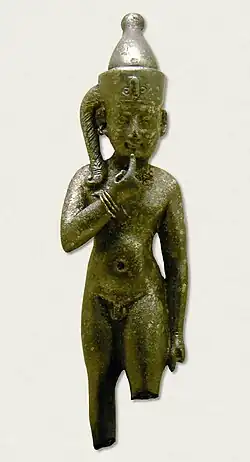 Assim, Harpócrates, Hórus enquanto criança, personifica o sol recém-nascido a cada dia, a primeira força do sol do inverno. As estátuas egípcias representam este Hórus como um garoto nu, com o dedo indicador sobre a boca - uma associação com o hieróglifo que significa "criança", sem qualquer relação com o gesto greco-romano e moderno que indica "silêncio". Os antigos gregos e romanos, no entanto, sem compreender o significado do gesto, fizeram de Harpócrates o deus do silêncio e do segredo, com base no relato de Marco Terêncio Varrão, que, ao falar sobre Caelum ("Céu") e Terra ("Terra") em sua obra De lingua latina, afirmou: