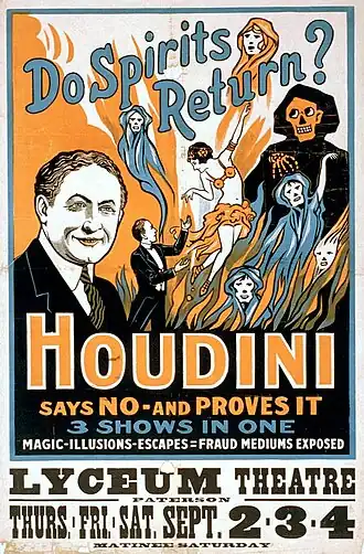 Houdini também atuou como um desenganador, tentando desmascarar determinadas pessoas que segundo ele eram charlatões disfarçados de paranormais.[4]