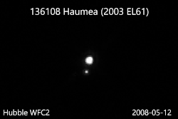 ![]() Imagem de baixa resolução do Telescópio Espacial Hubble de Haumea e suas duas luas, Hiʻiaka (acima) e Namaka (abaixo), junho de 2015 | |