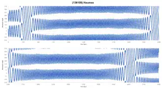 Pensa-se que Haumea esteja em uma ressonância orbital com Netuno intermitente de 7:12.[34] Seu nó ascendente Ω precessa com um período de cerca de 4,6 milhões de anos, e a ressonância é quebrada duas vezes por ciclo de precessão, ou a cada 2,3 milhões de anos, apenas para retornar uma centena de mil anos mais tarde.[2] Como essa não é uma ressonância estável, Marc Buie a qualifica como que não é ressonante.[46]