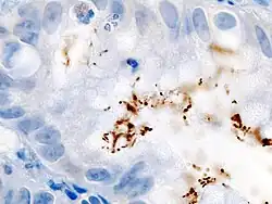 A Helicobacter pylori é uma bactéria de forma espiral, Gram-negativa, microaerófila, associada exclusivamente a células da mucosa gástrica,[30] sendo agente causador da gastrite crônica, úlcera péptica e duodenal e está associada com o incremento do câncer e linfoma gástricos.[31]