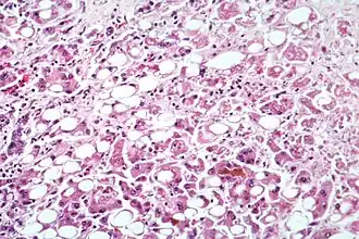| Doença hepática alcoólica evidente por transformação gordurosa, morte celular e corpos de Mallory | |