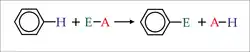 São reações de substituição em arenos envolvendo a presença de reagentes eletrolíticos (representado pela letra E na imagem 1 a seguir, e pode representar um cátion ou qualquer espécie com carga positiva parcial) responsáveis pela inserção direta de grupos como nitro (NO2), halogênios ou acilas (SOLOMONS e FRYHLE, 2001).