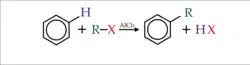 Introdução de uma cadeia (R) proveniente de uma espécie capaz de formar um carbocátion, como por exemplo um haleto de alquila (R-X, exceto haletos primários, que não formam carbocátion). O ácido de Lewis será responsável por transformar a cadeia utilizada em um eletrófilo, porém, qualquer outra combinação de reagentes que resulte em um carbocátion poderá ser utilizada, como um alceno e um ácido (SOLOMONS e FRYHLE, 2001).