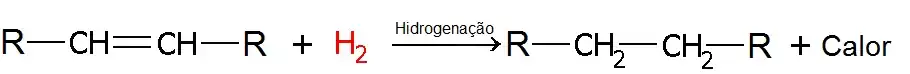 Hidrogenação é a reação química que ocorre quando uma molécula é obtida pela adição de hidrogênio a uma cadeia carbônica insaturada (aquela que contém dupla ou tripla ligação) normalmente na presença de um metal catalisador como níquel , platina ou paládio e dando origem a um alcano 9 . Este processo era utilizado pela indústria alimentícia na produção de margarinas a partir de óleos vegetais. É uma reação exotérmica, entretanto não ocorre em temperatura ambiente sem a presença de um catalisador e pode ser dividida em hidrogenação homogênea e hidrogenação heterogênea.