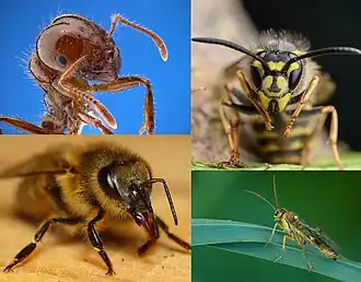 Himenópteros (Hymenoptera) são uma das maiores ordens viventes de insetos (assim delimitando os insetos himenópteros), compreendendo os grupos de insetos entendidos pelos leigos como as vespas, as abelhas e as formigas, além de diversos outros insetos menos populares (p.ex. as inúmeras vespas parasitoides de diferentes tamanhos, bem menos comuns de serem vistos). Mais especificamente, incluem aqueles insetos conhecidos como abelhas, zangões, cabas, marimbondos, mamangavas, cavalos-do-cão, formigas-feiticeiras, oncinhas, formigas saúvas, dentre muitos outros nomes populares. O nome da ordem Hymenoptera deriva do grego hymen para finas, membranosas e ptera, para asas, aludindo ao fato de quase todas espécies apresentarem dois pares de delicadas asas membranosas e transparentes, em que o primeiro par é sempre maior do que o posterior. Lembrando que, no entanto, existem muitos casos de himenópteros sem asas, como as operárias das formigas e as fêmeas das vespas "oncinhas" da família Mutillidae.[1]