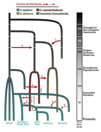 As espécies H. neanderthalensis e H. denisova divergiram de H. sapiens a partir de um ancestral comum (provavelmente representado por H. heidelbergensis ou H. rhodesiensis) que migrou da África a aproximadamente 500 mil anos atrás, dando origem aos Neandertais na Europa e Denisovanos na Ásia. Quando os Homo sapiens modernos se expandiram pelo mundo após 75 mil anos atrás encontraram esses outros hominínios, o que resultou em eventos de hibridação entre essas espécies.[3]