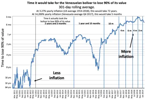 Recentemente, a inflação na Venezuela passou da casa de um milhão porcento ao ano durante o ano de 2018. Estima-se que ela possa passar dos dez milhões por cento no ano de 2019.[11][12][13][14]