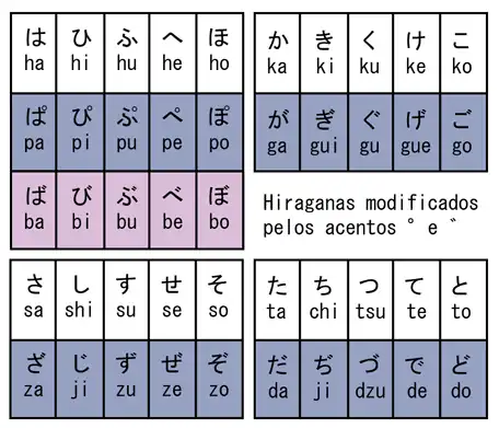 Existem 3 elementos utilizados como diacríticos em japonês: o handakuten ou maru ( ゜), um pequeno círculo, semelhante ao símbolo de grau; o dakuten ou ten-ten ( ゛), que lembra aspas; e o sokuon (っ), um tsu pequeno. Cada um deles é capaz de modificar o som do hiragana de uma maneira diferente, conforme a tabela abaixo: