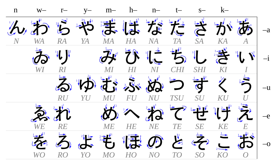 A tabela a seguir mostra o método para escrever cada caractere hiragana. A tabela está organizada de maneira tradicional, começando no canto superior direito e lendo as colunas para baixo. Os números e as setas indicam a ordem e a direção do curso, respectivamente.[3]