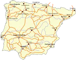 - A importante Via Augusta, que começava nos Pirenéus, em Juncária (La Jonquera, Gerunda), ligando com a Via Domícia da Gália Narbonense e descendia por toda a costa levantina em direção à Bética.