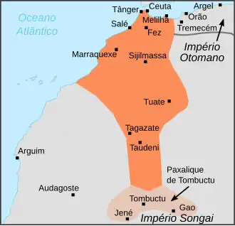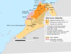 Durante o governo Português (1471-1661), Tânger é a capital do Algarve, em África, porque existem dois Algarves, a da Europa e a de África, tanto um como outro considerados territórios pessoais da Dinastia de Avis e depois da dinastia de Bragança (o rei de Portugal também tinha o título de Rei dos Algarves). Sob os reinados sucessivos de Afonso V, João II e Manuel I (período que marca o apogeu da expansão Portuguesa) o Algarve africano abrange quase toda a costa atlântica de Marrocos , com a excepção de Rebate e Salé. Os Portugueses controlam a parte costeira que se estende desde Ceuta até Agadir (Fortaleza de Santa Cruz do Cabo de Gué), tendo como marcos as praças fortes de Alcácer-Ceguer, Tânger, Arzila, Azamor, Mazagão e Safim e do Castelo Real de Mogador. Estas possessões formam as fronteiras, e são usadas como paradas na rota do Brasil e do Estado Português da Índia. No entanto, a maioria do Marrocos português é conquistada pelos sádidas em 1541. A última fronteira é a de Mazagão, recuperada pelos marroquinos em 1769. Os espanhóis, quanto a eles dominam parte da costa do Mediterrâneo com os presídios de Melilha e o Ilhote de Vélez de la Gomera, assim como a região de Tarfaya em frente das ilhas Canárias. Também conservam o controlo de Ceuta após a Restauração da Independência de Portugal em (1640). Os Oatácidas enfraquecidos, finalmente, cedem o poder a uma dinastia que reivindicava uma origem árabe Xerifiana, os sádidas) em 1554.[35]