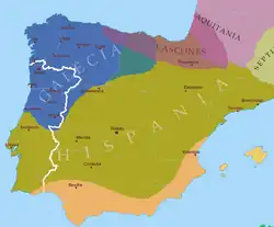 Em 415, os visigodos, inicialmente instalados na Gália, avançaram para sul como aliados do Império Romano para expulsar alanos e vândalos,[29] e fundaram um reino com capital em Toledo. A partir de 470, cresceram os conflitos entre o reino suevo e o vizinho reino visigodo. Em 585, o rei visigodo Leovigildo conquistou Braga e anexou a Galécia.[30] A partir daqui toda a Península Ibérica ficou unificada sob o reino visigodo (excepto algumas zonas do litoral sul e levantino, controladas pelo Império Bizantino e a norte pelos vascões). A estabilidade interna do reino foi sempre difícil, pois os visigodos eram uma minoria e professavam o arianismo, enquanto a população local era católica. A sua estratégia inicial foi manter-se como minoria dirigente estritamente separada da maioria autóctone. No entanto a consolidação dos seus reinos deu-se precisamente devido à integração com a população local, adoptando a língua latina, adaptando a lei romana e convertendo-se com Recaredo I ao catolicismo,[24] mas em 710 uma crise dinástica entre partidários dos reis Rodrigo e Ágila II levou à invasão muçulmana que resultou no colapso do reino.[31]