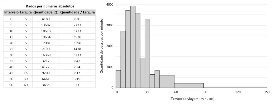 A construção de um histograma demonstra o número de casos por intervalo de unidade como a altura de cada bloco, de modo que a área de cada bloco é igual ao número de pessoas correspondente a sua categoria de tempo de viagem. A área das barras do histograma representa o valor absoluto ou o número total de casos (124 milhões de pessoas). Foi considerada a quantidade (Q) em milhares para este tipo de histograma o qual mostra números absolutos. Isto é, não existe uma representação por porcentagem e/ou decimais.[48]