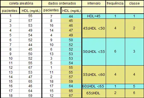 Tabulação dos dados das coletas de HDL realizadas em um grupo de 18 pacientes que foram agrupados em 6 classes delimitadas por intervalos de 5 mg/dL.