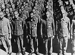 ![]() Judeus húngaros após desembarcarem dos trens em Auschwitz II, na Polônia ocupada, maio de 1944. Os que eram enviados para a direita (rechts) iam para os campos de trabalho forçado; os que iam para a esquerda (links) eram assassinados nas câmaras de gás. Os prisioneiros do campo são visíveis em seus uniformes listrados. | |
