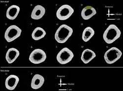 O osso cortical (a camada externa do osso) é extraordinariamente espesso, particularmente nas populações do Leste Asiático. A calota craniana tem sido freqüentemente confundida com fósseis de carapaças de tartaruga,[69] e o canal medular nos ossos longos (onde a medula óssea é armazenada, nos membros) é extremamente estreito (estenose medular). Este grau de espessamento é geralmente exibido em animais semi-aquáticos que usavam seus ossos pesados (paquiosteoscleróticos) como lastro para ajudá-los a afundar, induzido pelo hipotiroidismo. Os espécimes masculinos têm osso cortical mais espesso do que as mulheres.[70]