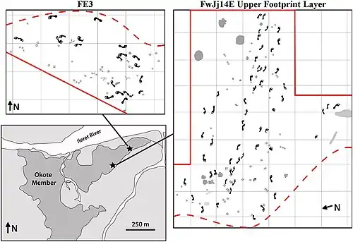 - 1 2 Hatala, Kevin G.; Roach, Neil T.; Ostrofsky, Kelly R.; Wunderlich, Roshna E.; Dingwall, Heather L.; Villmoare, Brian A.; Green, David J.; Harris, John W. K.; Braun, David R. (12 de julho de 2016). «Footprints reveal direct evidence of group behavior and locomotion in Homo erectus». Scientific Reports (em inglês) (1). 28766 páginas. ISSN 2045-2322. doi:10.1038/srep28766. Consultado em 19 de julho de 2021