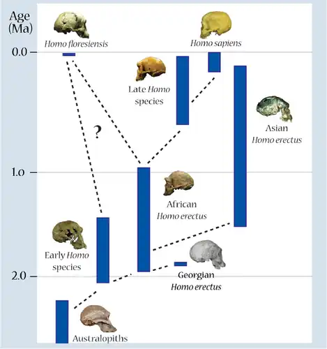- H. floresiensis seria um descendente de alguma linhagem de australopitecos.[6]