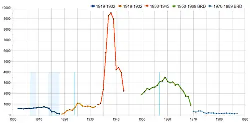 As táticas ativas de policiamento eram principalmente limitadas às grandes cidades; em áreas rurais, a polícia dependia de denúncias.[90] A diferença na estratégia de policiamento e provavelmente a super-representação e maior visibilidade de homossexuais em áreas urbanas levaram a taxas de condenação muito diferentes em diferentes partes da Alemanha. As condenações na Baviera e Mecklenburg ficaram abaixo da média nacional, enquanto na Província do Reno, Hamburgo e Berlim, elas excederam a média. Dentro dos estados, áreas urbanas tinham mais casos do que áreas rurais. Devido à dependência de denúncias em áreas rurais, um número desproporcional de casos envolvia abuso infantil ou "sedução da juventude".[104]