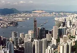 Fotografia aérea da Ilha de Hong Kong (direita) e de Kowloon (esquerda)
