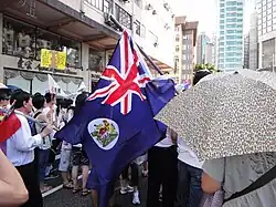 Pessoas marcham com a bandeira britânica de Hong Kong no dia da transferência da soberania para a China