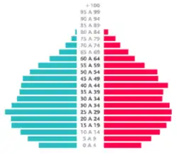 Em relação à pirâmide etária referente ao ano 2010, 13 117 (71,49%) pessoas tinham entre 15 a 64 anos da idade, 3 406 (18,56%) menos de 15 anos e 1 825 (9,95%) mais de 65 anos.[60] Trinta pessoas tinham mais de noventa anos; duas mulheres eram centenárias.[61]