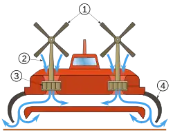 Tipicamente, os hovercrafts têm dois ou mais motores separados. Um dos motores é responsável pelo levantamento do veículo ao empurrar o ar para o interior da saia de borracha, chamado de hélices de sustentação.[2] Um ou mais motores adicionais são usados para proporcionar força propulsora para deslocar o barco na direção desejada, chamadas de hélices propulsoras. A direção é determinada pelo uso de lemes.