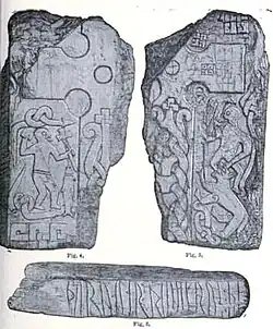 Uma parte da Cruz de Thorwald (uma parte sobrevivente da pedra rúnica erguida em Kirk Andreas na Ilha de Man) mostra um homem barbudo segurando uma lança para baixo em um lobo, seu pé direito em sua boca e um grande pássaro em seu ombro.[17] Andy Orchard comentou que que essa ave pode ser Huginn ou Muninn.[2] A Rundata data a cruz para 940,[18] enquanto Pluskowski a data para o século XI.[17] Esta descrição tem sido interpretada como Odin, com um corvo ou uma águia em seu ombro, sendo consumido pelo monstruoso lobo Fenrir durante os eventos do Ragnarök.[17][19]