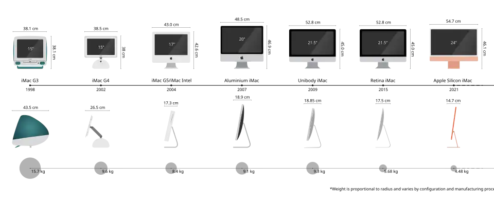 A linha do tempo do iMac de 1998 a 2021, comparando-o com o Macintosh 128K original (1984). Este gráfico mostra a mudança nas características físicas e na aparência do produto.