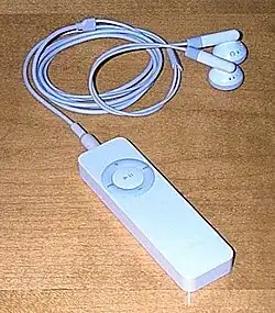 | Terceira | 2, 4 GB | Nova versão, com dimensões super reduzidas, sem botoes e design de "clip". Botões agora ficam no fone de ouvido. Sistema VoiceOver. | P2/USB | Fevereiro de 2009 | $59 (2 GB)