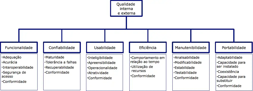 A norma ISO/IEC 9126, ou conjunto de normas que tratam deste assunto no âmbito da ISO, estabelece um modelo de qualidade com os seguintes componentes: