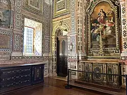 - um baldaquino em estilo barroco de autoria de Machado de Castro, por cima do altar, flanqueado por estátuas de madeira em tamanho natural.