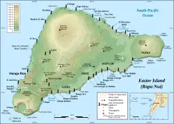 ![]() Mapa da Ilha de Páscoa mostrando Terevaka, Poike, Rano Kau, Motu Nui, Orongo e Mataveri. | |