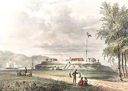Figura de Ternate realizada supostamente por um ilustrador holandês. No canto é possível ver o Forte de São João Baptista de Ternate, erguido na ilha