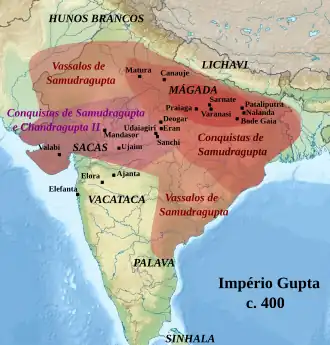 Os imperadores Chandragupta I (r. 320–335), Samudragupta (r. 335–375) e Chandragupta II (r. 375–415) foram os governantes mais notáveis da dinastia gupta.[8] O poeta sânscrito do século IV Calidasa credita os guptas como tendo conquistado cerca de 21 reinos, tanto dentro como fora da Índia, incluindo os reinos dos sacas, hunos, cambojas, as tribos locais em ambas as margens do Amu Dária, os cinaras, ciratas, etc.[9] O império gradualmente declinou a partir do século V devido, dentre outro fatores, a maior pressão dos governantes dos Estados vizinhos e a invasão dos hunos da Ásia Central que penetraram na Índia no Noroeste.[1]