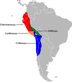 O avanço do império na Bacia Amazônica perto do rio Chinchipe foi interrompido pelos shuaras em 1527.[21] O império se estendeu da Argentina até a Colômbia. No entanto, a maior parte da porção sul do império Inca, a porção denominada Qullasuyu, estava localizada no Altiplano.