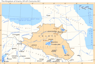 Os medos parecem ter estabelecido uma fronteira comum com a Lídia, na Anatólia central. Segundo Heródoto, hostilidades entre os medos e os lídios começaram cinco anos antes de uma batalha precisamente datada por um eclipse em 585 a.C. Se esse relato for verdadeiro, isso implica que, antes de 590 a.C., os medos já haviam subjugado Manai e Urartu. Julian Reade propôs que a entrada na Crônica Babilônica para 609 a.C. pode se referir a um ataque medo a Urartu em vez de um ataque babilônico. Esse evento, ocorrendo pouco antes dos ataques babilônicos em 608 e possivelmente 607 a.C., pode indicar que os babilônios forneceram apoio para a expansão meda para oeste no planalto anatoliano. Outra hipótese é que, já em 615 a.C., Ciaxares e Nabopolassar tinham forjado um plano para destruir tanto Urartu quanto a Assíria.[79] Sabe-se muito pouco sobre o fim de Urartu pois as fontes escritas termina após 640 a.C. e embora os citas e os medos serem postulados como responsáveis pelo fim de Urartu, o consenso geral é de que Urartu foi destruído pelos medos no final do século VII a.C.[97]
