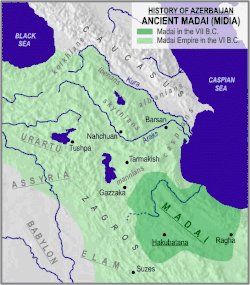 O Estado foi fundado inicialmente no que é hoje considerado o Azerbaijão histórico[9][10][11][12][13][14] ou no norte do Irã[15], mas rapidamente se expandiu e tornou-se uma das potências mais influentes da Ásia Ocidental, deixando marcas duradouras na história e cultura dos povos da região.[16]A confederação tribal dos madais se formou nas províncias a leste e sudeste do que é hoje o Azerbaijão Meridional.[17] Os medos são considerados um dos povos ancestrais envolvidos no etnogênese dos azerbaijanos modernos[18][19][20][21][22][23], e seu império é considerado o sucessor cultural, histórico e étnico do Estado de Manna.[24][25][26] O território medo localizava-se ao sudeste de Manna, e sua capital era Ecbátana (atualmente Hamadã).[27][28] O nome Mídia (Maday, Matay, Amadai) aparece pela primeira vez em fontes do século IX a.C.[29] No século IX–VIII a.C., o território era controlado por pequenos governantes locais. A província de Gizilbunda, pertencente a Manna, formava a fronteira entre os dois territórios.[30]