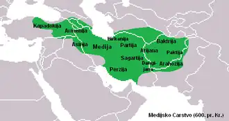 Segundo a historiografia clássica, a Média emergiu como uma grande potência no antigo Oriente Próximo após o colapso da Assíria. Sob Ciaxares (r. 625–585 a.C.), as fronteiras do país foram estendidas para leste e oeste com a subjugação de povos vizinhos, como os persas e armênios. A expansão territorial da Média resultou na formação do primeiro império iraniano, que no auge de sua extensão territorial teria exercido controle sobre mais de dois milhões de quilômetros quadrados, estendendo-se das margens orientais do rio Hális, na Anatólia, até a Ásia Central. Nesse período, o Império Medo[c] foi uma das grandes potências econômicas, políticas e militares do antigo Oriente Próximo juntamente com a Babilônia, Lídia e Egito. Durante seu reinado, Astíages (r. 585–550 a.C.) empenhou-se para fortalecer e centralizar o Estado medo, contrariando a vontade da nobreza tribal, o que pode ter contribuído para a queda do reino. Em 550 a.C., a capital meda Ecbátana foi conquistada pelo rei persa Ciro II, marcando o início ao Império Aquemênida.[32]
