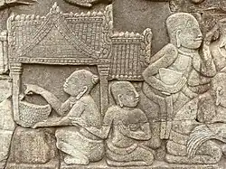 As pessoas comuns vestiam um sampot onde a frente era puxada entre as pernas e presa atrás por um cinto. Nobres e rajás usavam tecidos mais finos e ricos. As mulheres usavam uma tira de pano para cobrir o peito, enquanto as mulheres nobres usavam uma tira alongada que ia até o ombro. Homens e mulheres usavam um krama. Junto com representações de batalha e conquistas militares de reis, os baixos-relevos de Bayon retratam a vida cotidiana mundana de pessoas quemeres comuns, incluindo cenas do mercado, pescadores, açougueiros, pessoas jogando xadrez e jogos de azar durante brigas de galos.