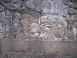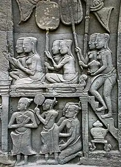 Os extensos projetos de irrigação forneceram excedentes de arroz que poderiam sustentar uma grande população. A religião oficial era o hinduísmo, mas influenciada pelo culto de Devaraja, elevando os rajás quemeres à categoria de deuses vivos na terra, atribuída à encarnação de Víxenu ou Xiva.[44] Na política, esse status era visto como a justificativa divina do governo de um rei. O culto permitiu que os rajás quemeres embarcassem em enormes projetos arquitetônicos, construindo monumentos majestosos como Angkor Wat e Bayon para celebrar o governo divino do rei na terra.