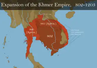 O império cresceu a partir das antigas civilizações de Funan e Chenla, às vezes governou e/ou vassalizou a maior parte do sudeste da Ásia continental[4] e partes do sul da China, estendendo-se da ponta da península da Indochina ao norte até a moderna província de Iunã, na China, e do Vietnã até Mianmar.[5][6]