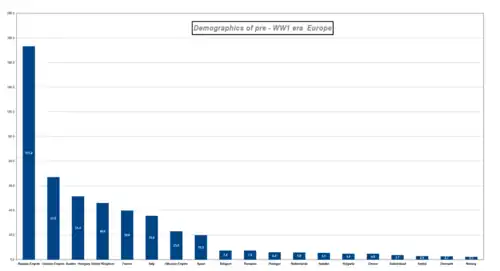 Grande parte da expansão da Rússia ocorreu no século XVII, culminando na primeira colonização russa do Pacífico, na Guerra Russo-Polonesa de 1654-1667, que levou à incorporação da margem esquerda da Ucrânia, e na conquista russa da Sibéria. A Polônia foi dividida por seus rivais entre 1772 e 1815; a maior parte de suas terras e população foram tomadas sob o domínio russo. A maior parte do crescimento do império no século XIX veio da conquista de territórios na Ásia Central e Oriental, ao sul da Sibéria.[22] Em 1795, após as Partições da Polônia, a Rússia se tornou o estado mais populoso da Europa, à frente da França.