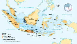 ![]() Extensão da área de influência Majapahit, baseado no Nagarakertagama; a precisão de tais representações javanesas é controversa.[1] | |||||||||||||||||