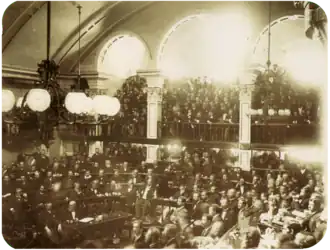 O país gozava de um considerável prestígio internacional durante os últimos anos do império[110] e tornou-se uma potência emergente no cenário internacional. Enquanto Pedro II recebia tratamento médico na Europa, o parlamento aprovou e a princesa Isabel assinou em 13 de maio 1888, a Lei Áurea, que aboliu completamente a escravidão no Brasil.[111] Previsões de perturbações econômicas e de trabalho causadas pela abolição da escravatura provaram-se infundadas.[112] No entanto, o fim da escravidão foi o golpe final para qualquer crença restante na neutralidade da coroa e isso resultou em uma mudança explícita do apoio ao republicanismo pelos ultraconservadores,[113] que eram apoiados por ricos e poderosos fazendeiros de café que tinham grande poder político, econômico e social no país.[114]