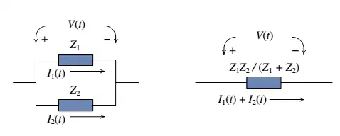 Se os dois dispositivos estiverem ligados em paralelo, como no caso da figura ao lado, em qualquer instante a diferença de potencial será a mesma nos dois dispositivos e a corrente total no sistema será a soma das correntes nos dois dispositivos. Isso, junto com a lei de Ohm generalizada , permite-nos concluir que o sistema pode ser substituído por um único dispositivo com impedância: