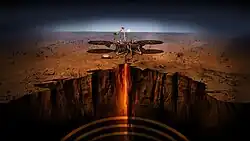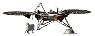 Braço robótico da sonda InSight, juntamente com o instrumento SEIS, março de 2015Seismic Experiment for Interior Structure(SEIS): consiste de um sismógrafo para medidas precisas de terremotos e outras atividades internas em Marte, para entender melhor a história e a estrutura do planeta.[32][33][34] Também investigará como a crosta marciana e o manto respondem aos efeitos dos impactos de meteoritos, que dão pistas à estrutura interna do planeta. O SEIS é desenvolvido pela Agência Espacial Francesa (CNES), com a participação do Instituto de Física do Globo de Paris (IPGP), do Instituto Federal Suíço de Tecnologia (ETHZ), do Instituto Max Planck para Pesquisa do Sistema Solar (MPS), Imperial College, Instituto Superior da Aérea e do Espaço (ISAE) e do JPL.[35][36] O sismômetro também detectará fontes de ondas atmosféricas e sinais gravimétricos (forças de maré) da lua marciana Fobos, e ondas sísmicas de alta frequência a 50 hertz.[37][38]